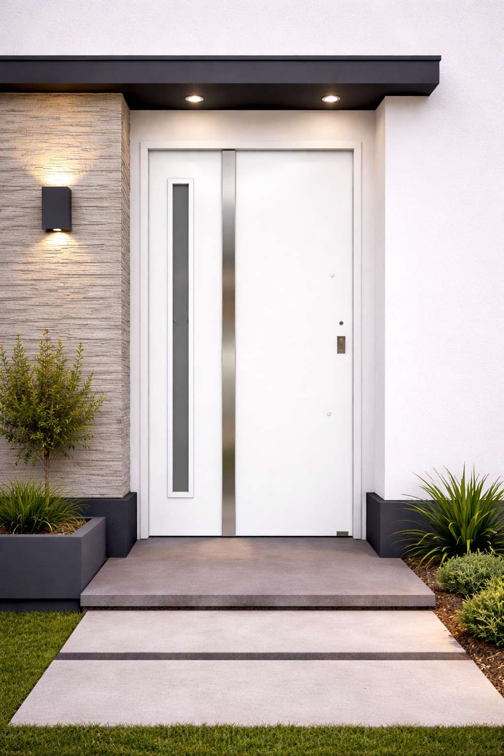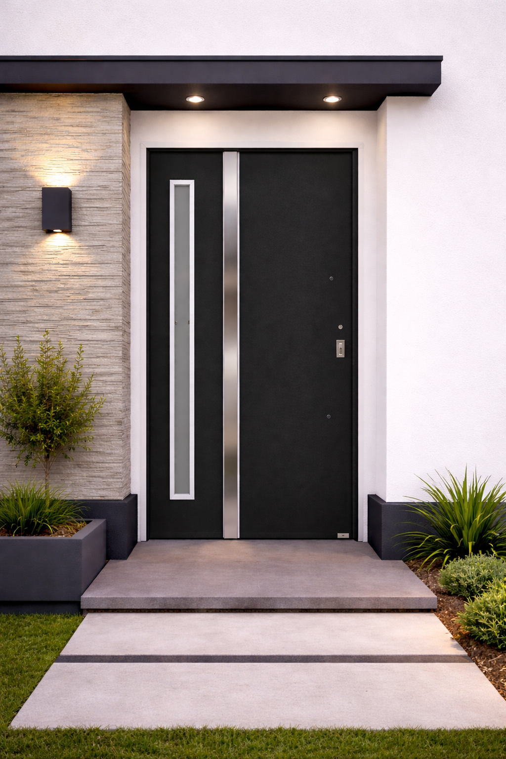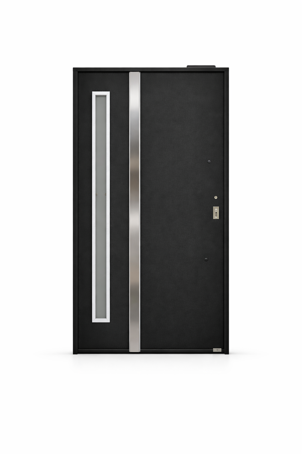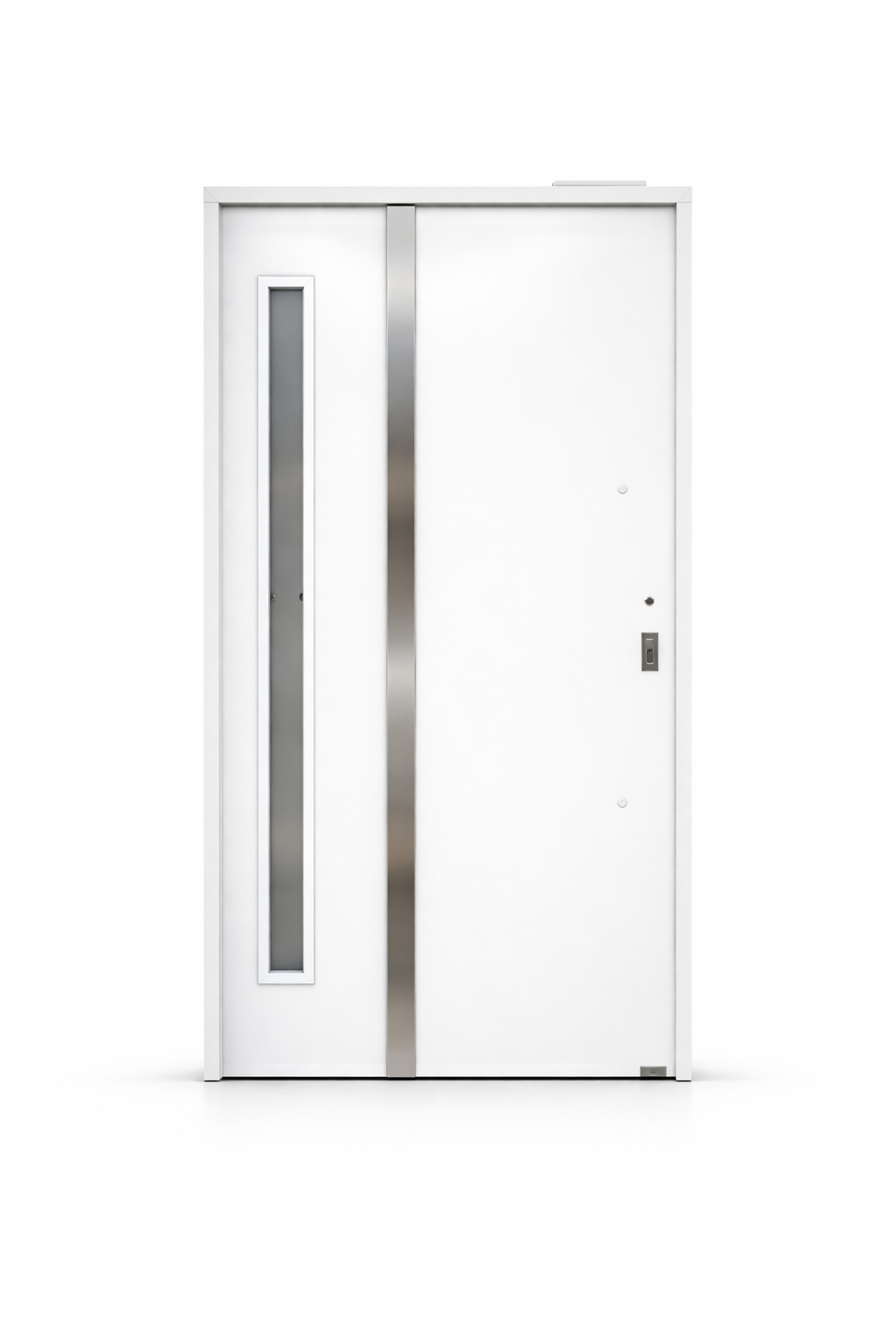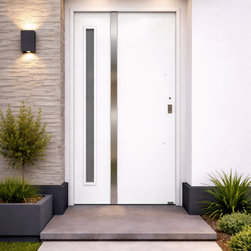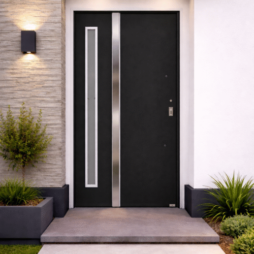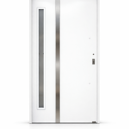 El diseño incorpora vidrio vertical, ideal para permitir el ingreso de luz natural sin perder privacidad, acompañado por barral de acero inoxidable y cerradura con cilindro europerfil, logrando una combinación perfecta entre estética moderna y funcionalidad.