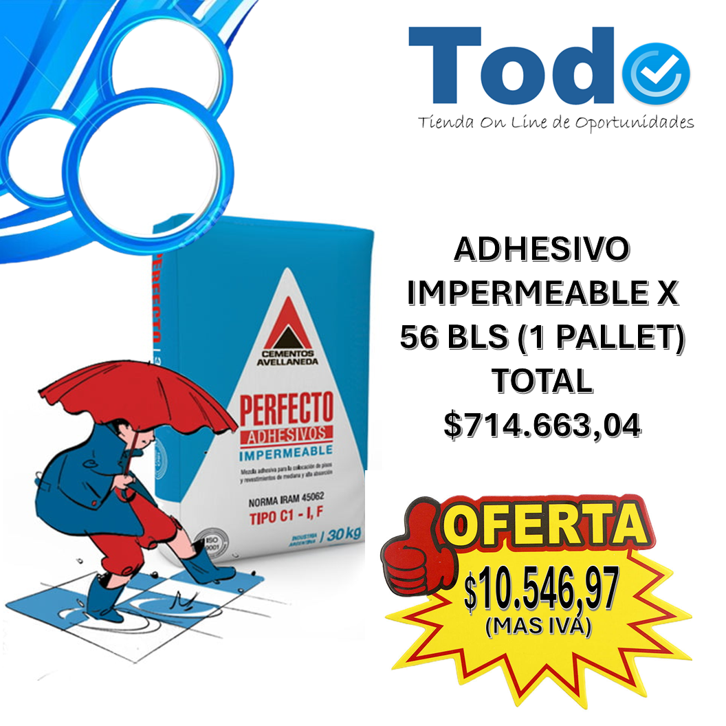 Ponemos a la venta una oportunidad única para profesionales y distribuidores: 1 pallet con 56 bolsas de adhesivo PERFECTO impermeable Cementos Avellaneda x 25 kg por un total de $714.664,04 IVA incluido, lo que deja cada bolsa a solo $10.546,97 + IVA.