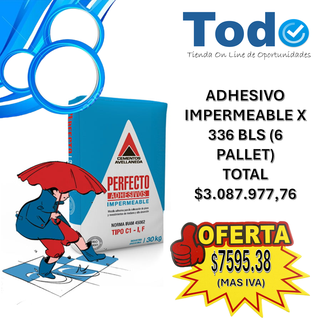 Ponemos a la venta una oportunidad imperdible para constructores, empresas y revendedores: 6 pallets (56 bolsas cada uno) de adhesivo PERFECTO impermeable Cementos Avellaneda x 25 kg, sumando un total de 336 bolsas.
