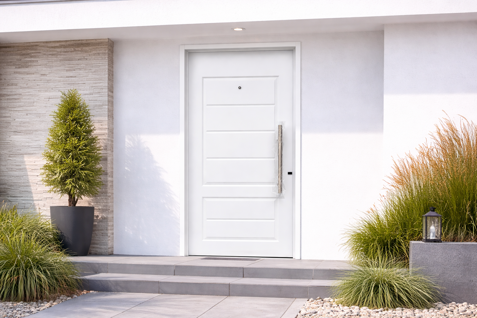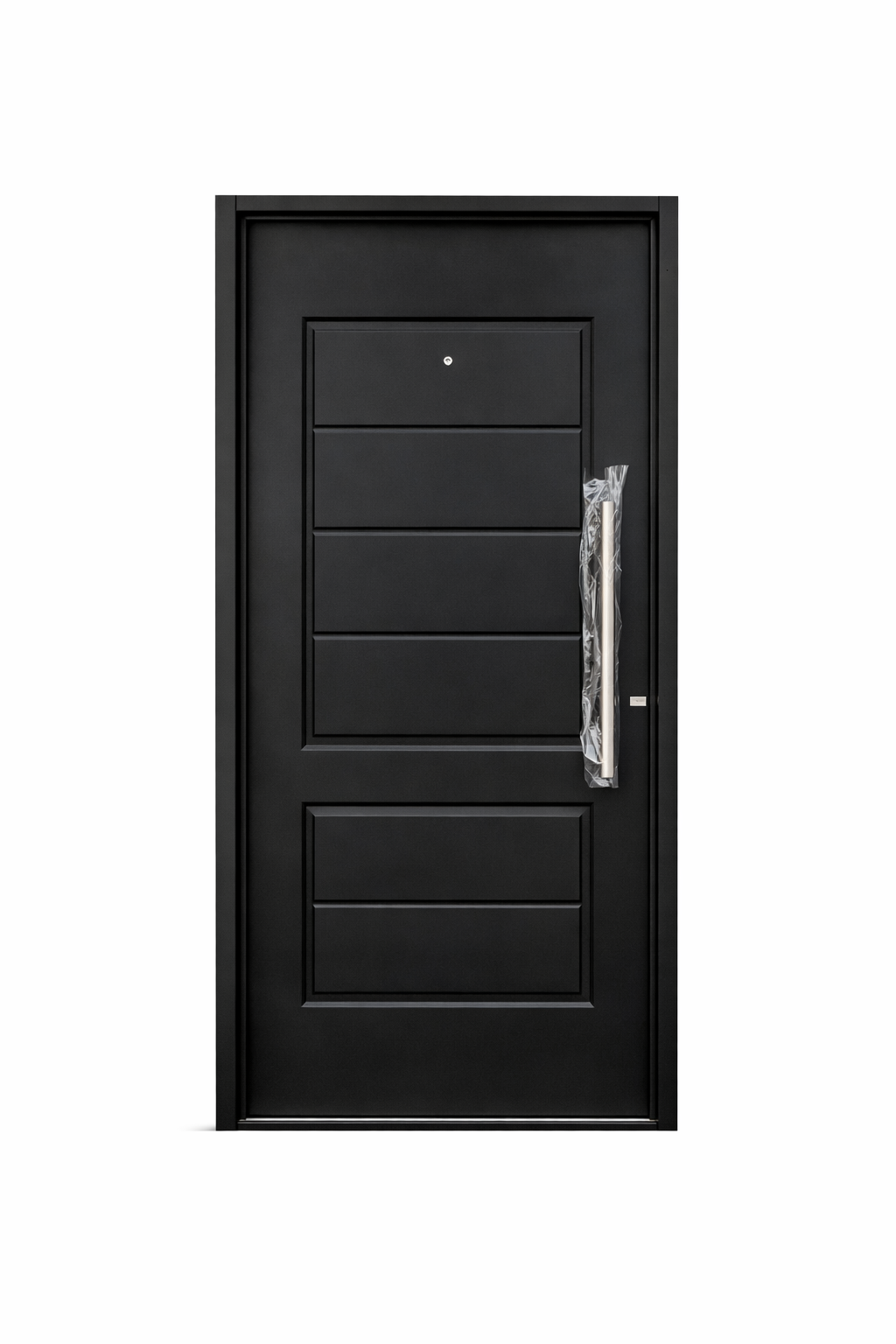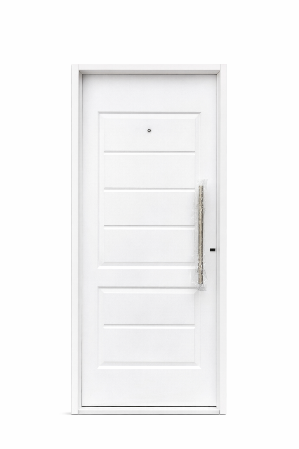 Su diseño incorpora barral curvo de acero inoxidable, que aporta comodidad de uso y un estilo contemporáneo, acompañado de mirilla óptica, permitiendo visualizar el exterior sin necesidad de abrir la puerta.