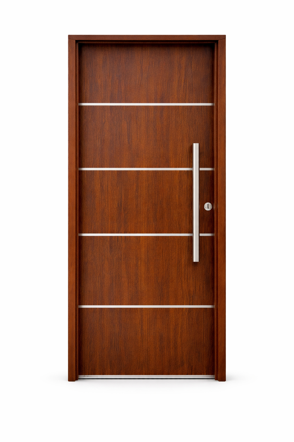 Fabricada con sistema de doble chapa inyectada, ofrece una estructura robusta y duradera, junto con excelente aislamiento térmico y acústico. Su terminación simil madera en tono oscuro con pintura epoxi brinda un acabado sofisticado, resistente al desgaste y a las condiciones climáticas.