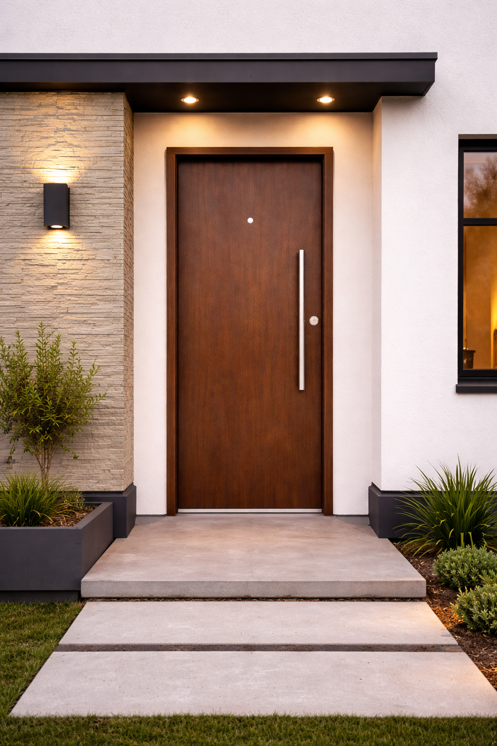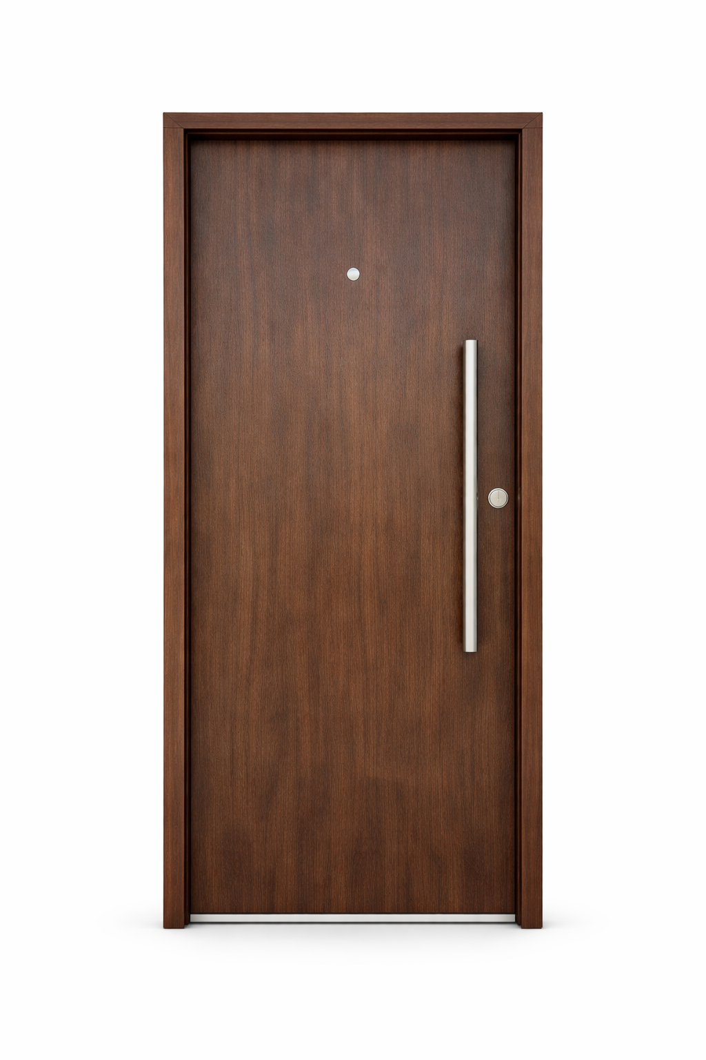 Fabricada con sistema de doble chapa inyectada, ofrece una estructura sólida, gran durabilidad y excelente aislamiento térmico y acústico. Su terminación simil madera tono caoba en pintura epoxi brinda un acabado elegante y natural, resistente al desgaste y a las condiciones climáticas.