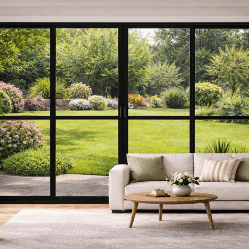 La Ventana Balcón de Alto Tránsito en aluminio herrero negro es una solución ideal para espacios amplios que requieren máxima apertura, resistencia y diseño moderno, perfecta para integrar interiores con exteriores.